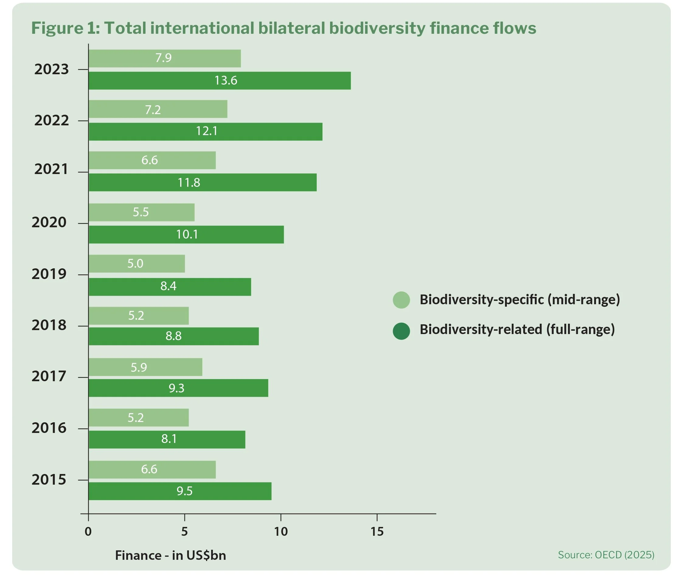 Donors’ biodiversity-related bilateral development finance flows have increased from US$9.5 billion in 2015 to US$13.6 billion in 2023. Since 2022, this is an increase of US$1.5 billion.