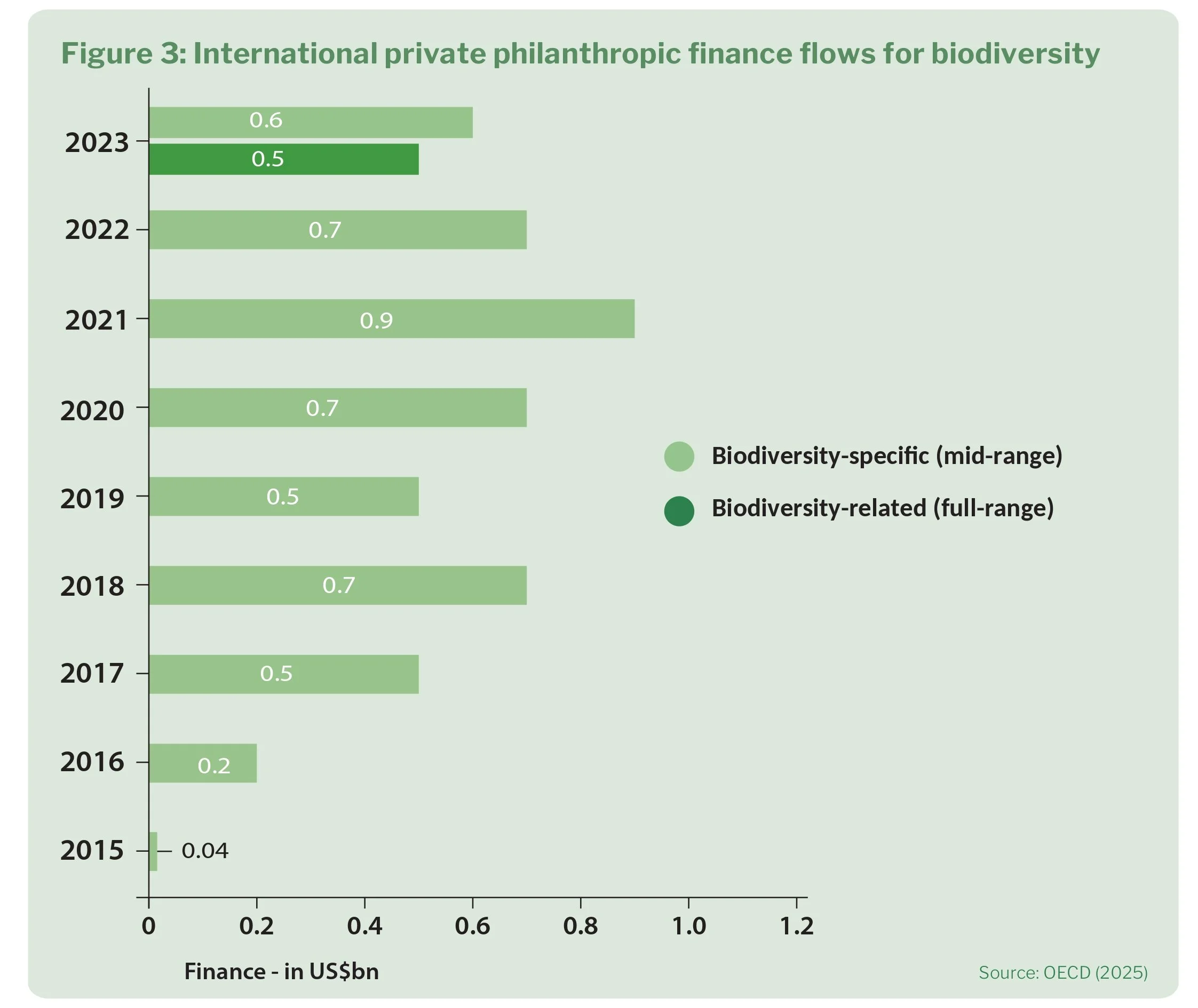 International biodiversity-related philanthropy has increased overall from US$0.04 billion in 2015 to US$0.6 billion in 2023. A decrease from a peak of US$0.7 billion in 2022.